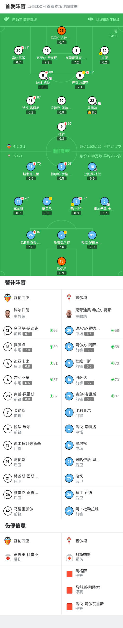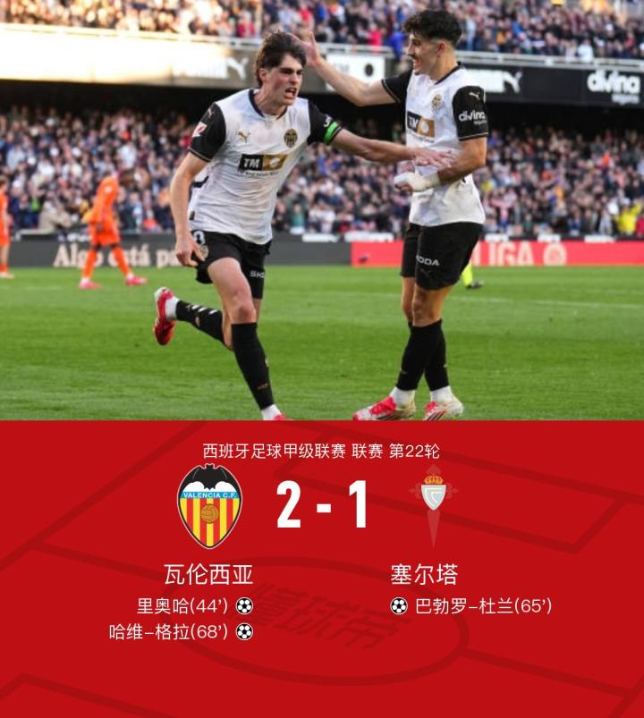最终,瓦伦西亚以2-1的比分力克塞尔塔,赢得了本场比赛的胜利。哈维-格拉和里奥哈的精彩表现成为球队取胜的关键,受到球迷和教练组的一致称赞。这场胜利也让瓦伦西亚在积分榜上有了更进一步的进步,球队士气大振,信心满满。接下来的比赛,他们将继续努力,希望能够取得更好的成绩。